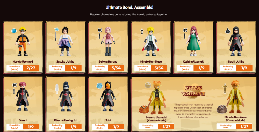 Descubre variantes raras, como Naruto Uzumaki (Modo Kurama) y Minato Namikaze (Modo Kurama). Cada caja incluye una tarjeta de personaje y una base transparente, con una impresión exquisita y diseños fieles al anime que capturan la esencia de Naruto Shippuden.