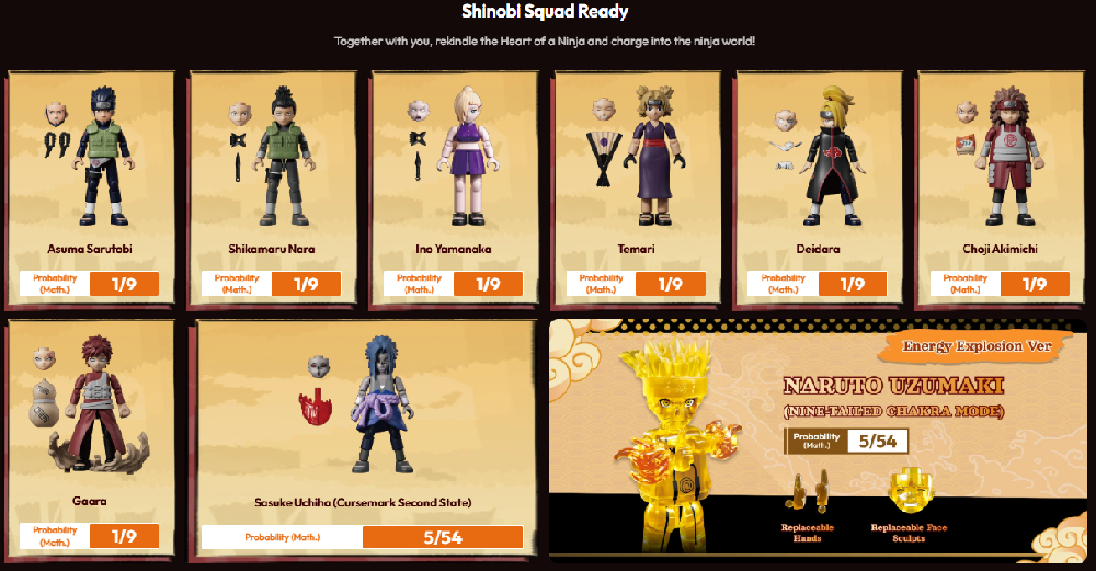 ¡El escuadrón shinobi definitivo hace una aparición espectacular! Con licencia oficial, estos esperados juguetes de personajes ninja han llegado, reuniendo a personajes icónicos de todas las facciones para encender tu pasión por el mundo ninja. Cada juguete se compone de 35 a 49 piezas, con una articulación superior y accesorios exclusivos que capturan fielmente cada detalle.